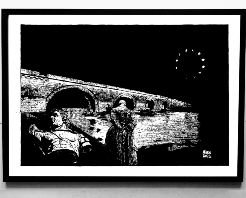 It builds on my previous series, Cities of Lost Memory. I also create my drawings around a City, but the common thread is a religious subject. For example, in ‘Finding new gods’, I tried to visualise the way in which Skopje, the capital of New Macedonia, tries to rediscover its identity, to encounter what it believes will qualify it as European. In the process, ideals, history, mythology, old communism and Christianity all merge together. In my second drawing, ‘Brotherly Love’, about Venice and Constantinople, I tried to crystallise centuries of love-hate relations between two powerful, established cities at opposite ends of the Christian spectrum. But you can also see the corruption of power and money in religious affairs.